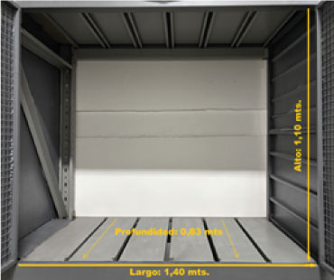 Las medidas internas en mts son largo 1.40 x profundo (ancho) 0.83 x Alto 1.10. Es decir, un Total de 1.16 mts2 y un total de 1.28 mts3 (metros Cúbicos).